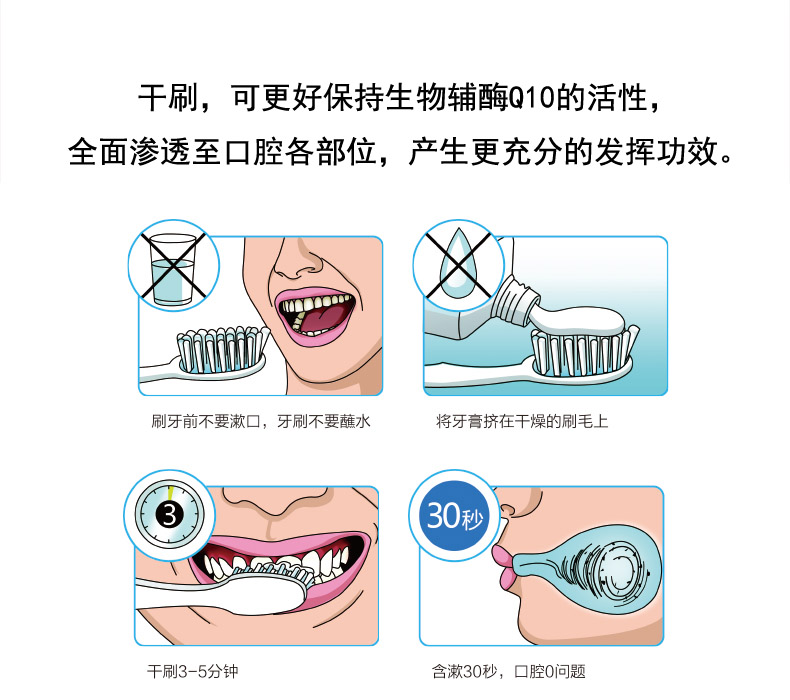 1.本品提倡不(bù)蘸水(shuǐ)幹刷,使生(shēng)物(wù)輔酶 ®♣Q10不(bù)被稀釋,充分(fēn)保持活性,更好(hǎo)發揮功效;× ×